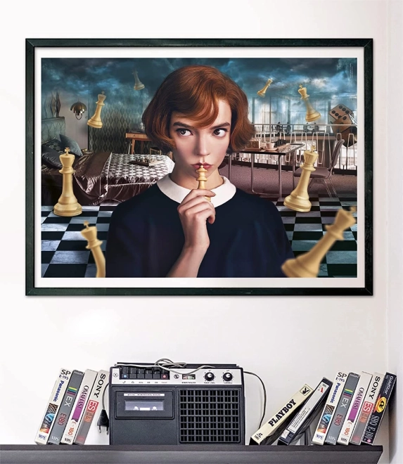 Stilfuldt puslespil med motiv fra serien Netflix: The Queen’s Gambit, der byder på 1000 brikker til underholdende samling og et dekorativt resultat på cirka 70 × 50 cm. Ideelt til elskere af skak, design og kvalitets‑puslespil.