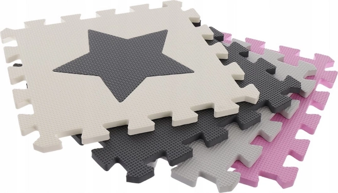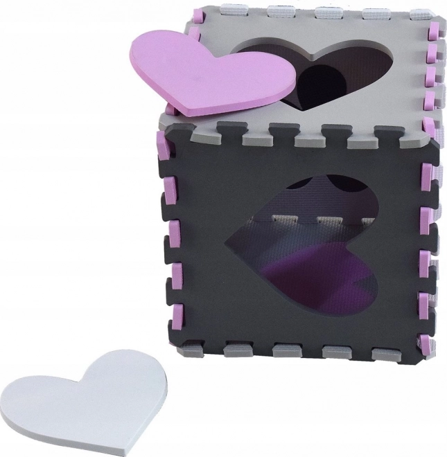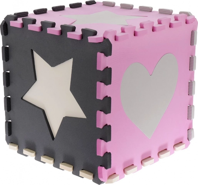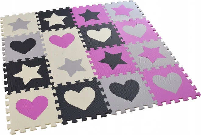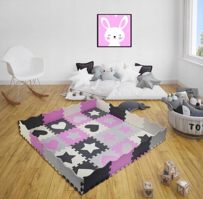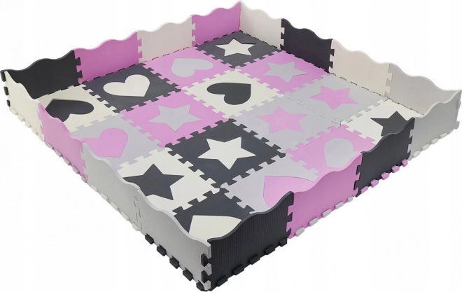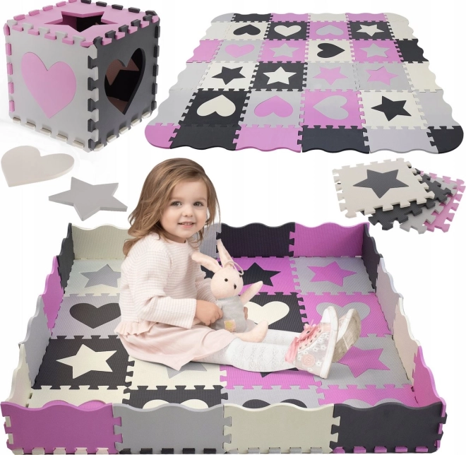 Stilfuld skummåtte med hjerter og stjerner i lyserød og grå, som skaber et sikkert og behageligt legeområde for børn fra 3 år. Delene passer nemt sammen; måtten er blød, vaskbar, dæmper støj og isolerer mod kulde. Inkluderer også kant- og hjørnestykker for en pæn, afsluttet kant.