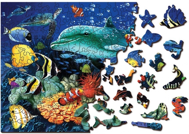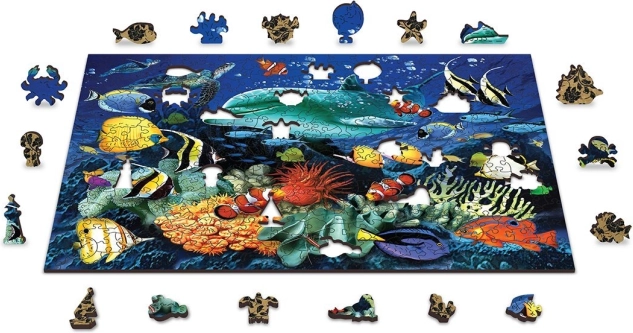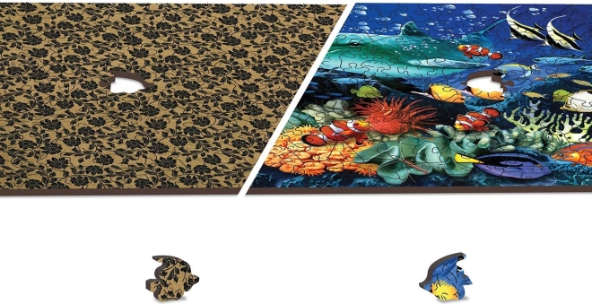 Oplev smart underholdning med et træpuslespil, der glæder med et detaljeret undervandsmotiv og imponerer med dobbeltsidet udførelse. Du kan lægge efter billedet på forsiden eller efter det gentagne mønster på bagsiden – ideelt til træning af koncentration og rumlig forestillingsevne.