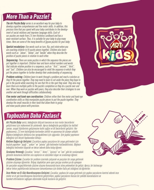Vi præsenterer Babypuslespil fra serien Art Kids, som fokuserer på udviklingen af børn fra en tidlig alder. Hvert puslespilselement er fremstillet med omtanke for små hænder for bedst muligt at støtte deres hånd-øje-koordination og problemløsningsevner.