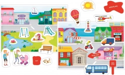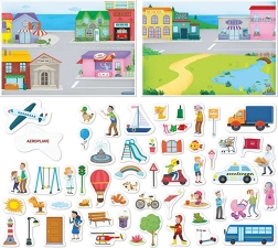 Under legen matcher børn genstande og figurer til deres rette miljø, hvilket styrker ordforråd og forståelse af sammenhænge. Produktet er en del af den økologiske Play for Future-serie – materialerne er skånsomme mod naturen og egnede til sikker leg.