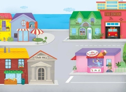 Børn matcher billeder med miljøer og tilegner sig naturligt mere end 50 engelske ord – fra ting i hjemmet til steder i byen.