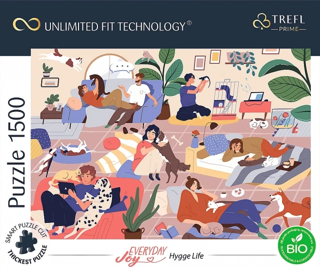 Nyd rolig puslespilshygge med motiv af det bekvemme liv i TREFLs kvalitetsudførelse. Puslespillet med 1500 brikker bruger UFT – Unlimited Fit Technology, som gør det muligt at forbinde flere motiver til én collage. Højkvalitets blåt karton, unikke brikkeformer og stærk samling for nem flytning af det færdige billede suppleres af økologisk emballage uden plastfolie.