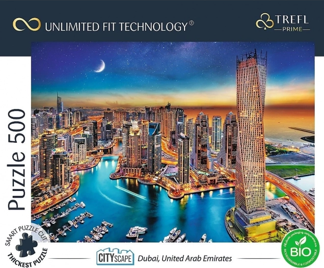 Oplev smart puslespilslægning med TREFL UFT Cityscape: Dubai på 500 brikker. Takket være Unlimited Fit Technology kan du lægge og forbinde flere motiver til en stor collage, hvor du selv sætter grænserne. Du får højeste kvalitet i blå karton, unikke brikformer og stabil samling for nem flytning af det færdige billede. Det miljøvenlige bio-emballage uden plastfilm glæder alle, der værner om naturen.