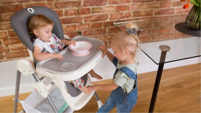 6 sædehøjder, 3 ryglænspositioner og 3-trins justering af bakken sikrer komfort fra de første måltider til selvstændig spisning.