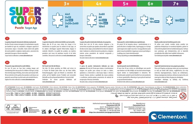 Puslespil fra Clementoni er kendetegnet ved præcise udskæringer, mættede farver og kvalitetskarton. Det færdige billede kan tages fra hinanden og samles igen, eller det kan limes og blive til en original dekoration til børneværelset.