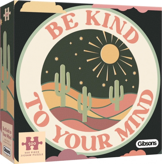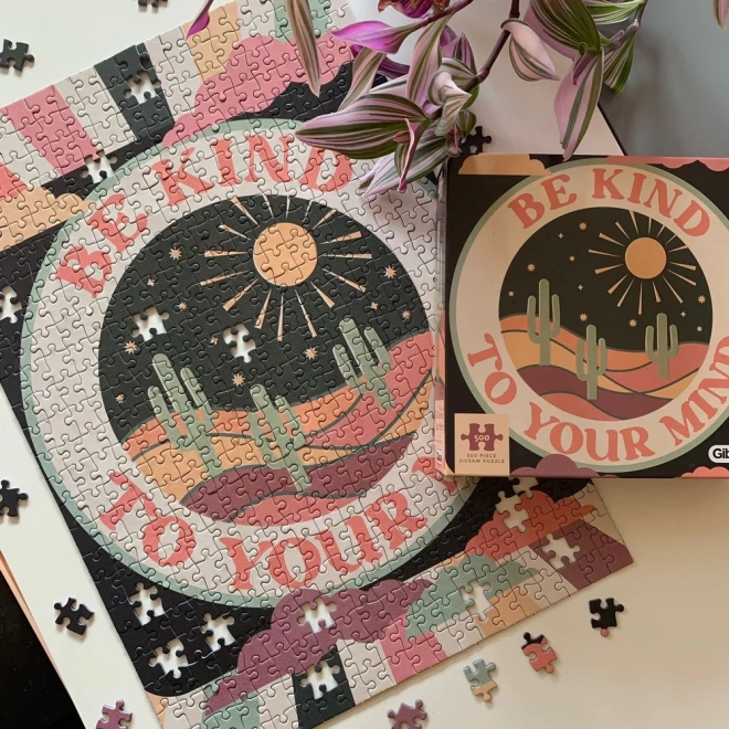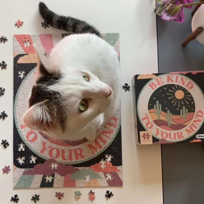Moderne puslespilsdesign med motivet Vær Venlig Mod Dit Sind er ideelt for dem, der ønsker at undgå traditionelle motiver og bringe frisk stil ind i deres hjem.