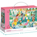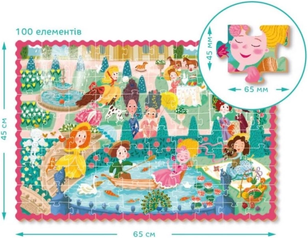 Glade børnepuslespil til små eventyr-elskere: 100 brikker med motiv af prinsesser på promenade i størrelsen 65 × 45 cm. Ideelt fra 5 år, støtter udvikling af logisk tænkning, tålmodighed og finmotorik. En praktisk æske med hank for nem transport sikrer underholdning hjemme og på farten.