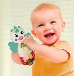 Den interaktive rangle Enhjørning er designet til barnets naturlige udvikling. Kombinationen af blød gummi på de små vinger til sikker tandspring-bid og de mange teksturer giver rig multisensorisk stimulering. Den lette konstruktion passer i små hænder og stimulerer syn, hørelse og følesans.