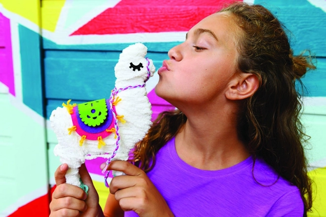 Indeholder alle materialer, der er nødvendige for at lave en lama, inklusive kartonudskæringer, farvede tråde og stofstykker.