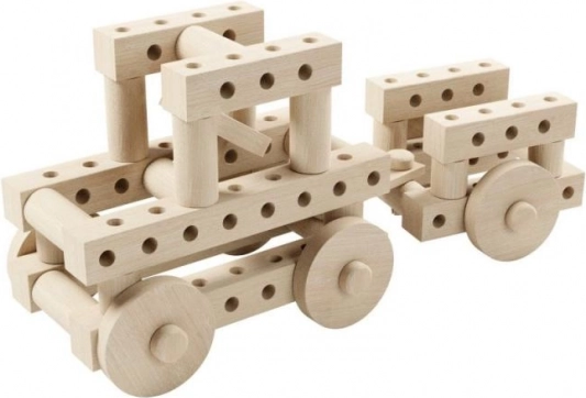Indeholder bøgetræscylindre med en diameter på 32 mm, bjælker og hjul med huller, som understøtter ubegrænset kreativitet og udvikling af finmotorik.