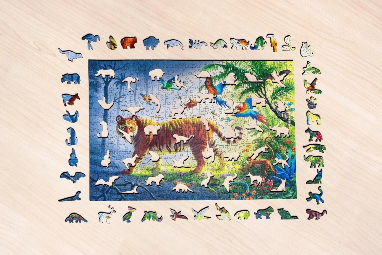 Træpuslespillet Tiger i junglen kombinerer præcis europæisk produktion med et betagende motiv. Hver brik er unik – du finder blandt andet former som dyr, blomster og andre objekter, der gør lægningen endnu sjovere og visuelt mere attraktiv. Takket være materialets styrke og den præcise udskæring holder puslespillet sammen, og gentagen brug tager det i stiv arm.