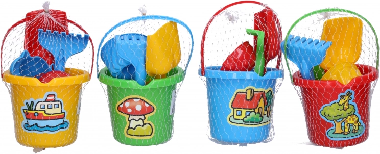 Praktisk sandsæt til børn med en lille spand i målene 10 × 11 cm – ideelt til legepladsen og stranden. Indeholder spand, rive, skovl og 3 forme (fisk, sandkage, and). Fås i 4 farvevarianter – blå, rød, gul og grøn.