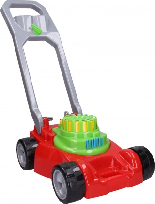 Plæneklipper. Sammenklappet plæneklipper 68(l) x 28(b) x 55(h) cm, inklusive håndtag. Forhjulene er frie, baghjulene klikker under kørsel. Plæneklipper uden håndtag 37x28x19 cm. I håndtaget er der en klikvende drejekontakt. I midten af plæneklipperen er der en farvet roterende spiral, som sættes i gang ved at trække eller skubbe håndtaget.