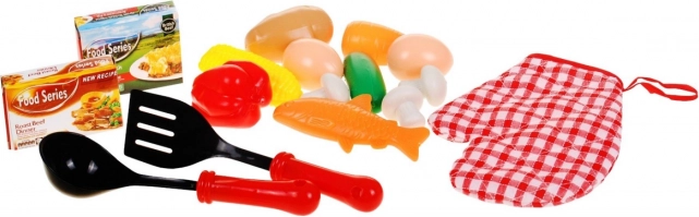 - mange tilbehør til stegning og kogning (champignoner, majs, agurk, kartoffel, peberfrugt, gulerod, æg, fisk, emballager som simulerer krydderier)