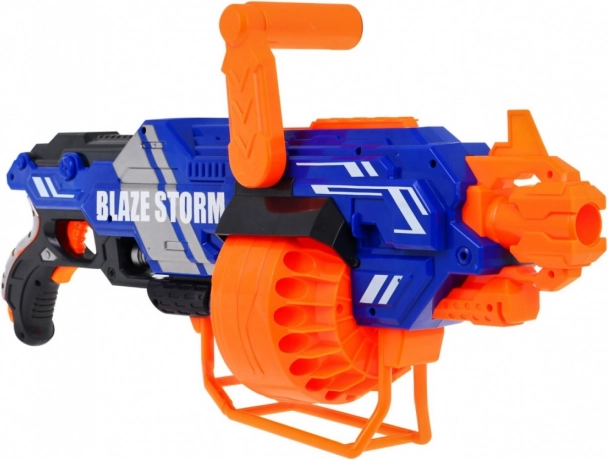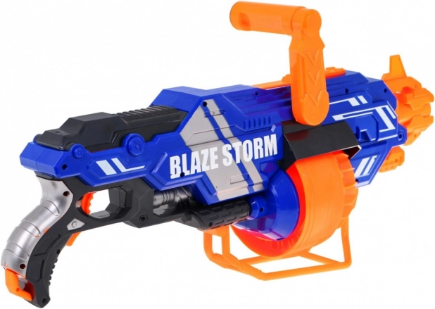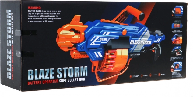 BLAZE STORM blasteren er let at betjene og perfekt til dynamisk leg både inde og ude. indsæt blot batterier (8× AA 1,5 V, medfølger ikke), fyld tromlemagasinet, hold strømknappen nede og tryk på aftrækkeren. Du kan vælge enkeltvis skydning eller kontinuerlig byge alt efter hvor længe du holder aftrækkeren inde.