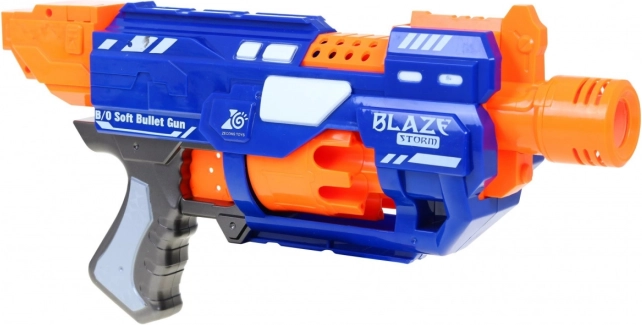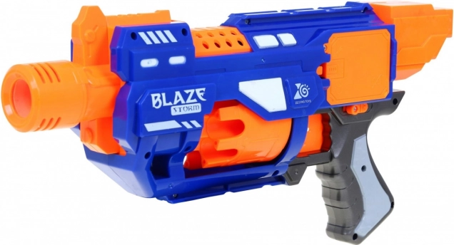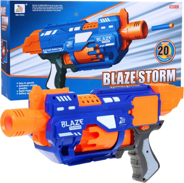Sjov og sikker blaster til børn BLAZE STORM til 6+ med automatisk roterende tromlemagasin og nem betjening. Indeholder 20 skumkugler, har rækkevidde op til 10 m og halvautomatisk skydetilstand til dynamisk leg inde og ude. Drives af 3× AA-batterier (medfølger ikke).