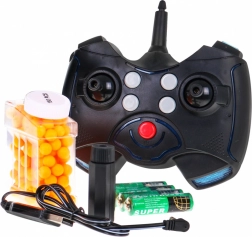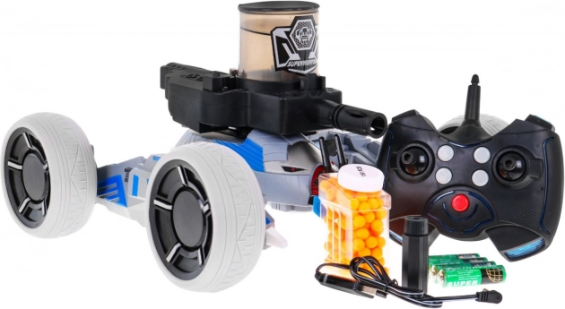 - Bil, fjernbetjening, dunk med 150 kugler, USB-kabel til opladning, batterier til fjernbetjening og sigte, akkumulator til køretøj, klistermærker, manual