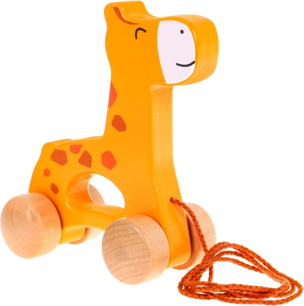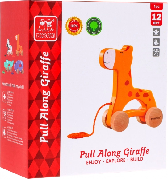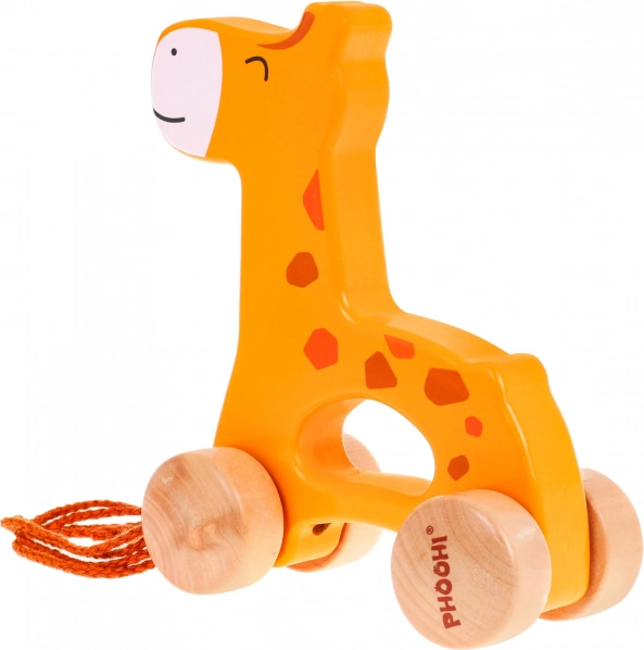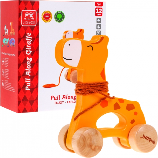 Træhjul og en enkel snor gør det nemt for børn at trække giraffen over forskellige overflader.