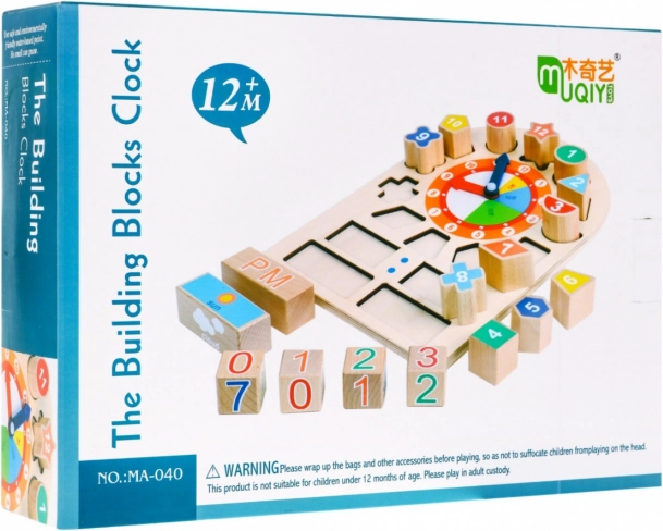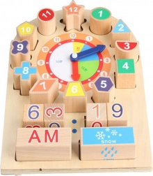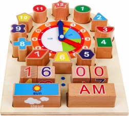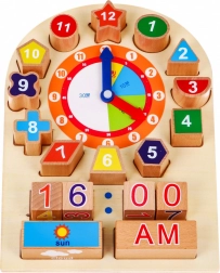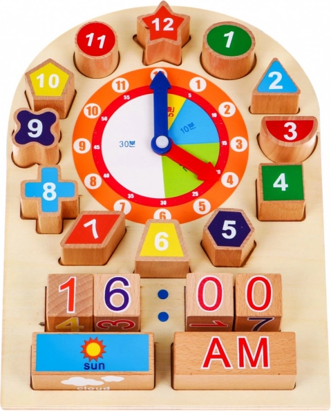 Dette træsæt med ur hjælper dit barn med let at genkende klokkeslæt, tid på dagen, vejret og måneder. Det indeholder to bevægelige visere, som frit kan indstilles til forskellige tider. Barnet kan straks angive tiden ved hjælp af talklodserne og også genkende tidspunktet på dagen, om det er solrigt, overskyet, regnfuldt eller snevejr. Talklodserne har forskellige former, som skal placeres korrekt på tavlen.