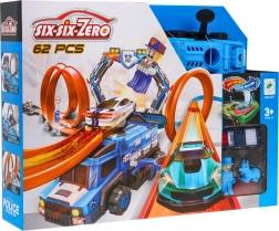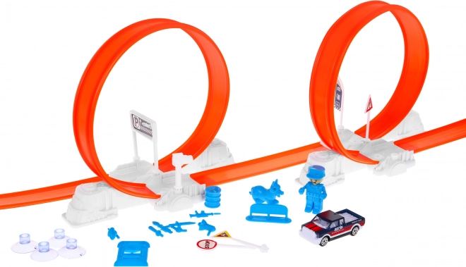 Byg din egen adrenalinfyldte bane med polititema og send bilerne gennem to store loops med fuld 360°-rotation. Den kraftige affyrer sikrer den nødvendige fart, og den store politilastvogn bliver centrum for hver biljagt. Den særlige bil skifter farve, når den bliver våd, så hver tur byder på nye effekter og historier.