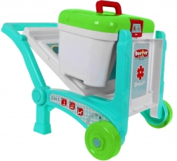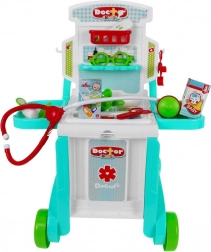 Dette børnelægesæt i blide pastelfarver giver timevis af leg og læring. Bordet på hjul kan nemt laves om til to forskellige vogne afhængigt af barnets alder og højde, mens kufferten sikkert rummer alle redskaber. På bordet finder du 2 sidehylder til nødvendigt udstyr og en topsektion med hylder og kroge til 'medicin' og tilbehør. Takket være håndtaget kan hele klinikken bekvemt flyttes fra rum til rum.