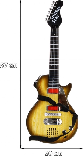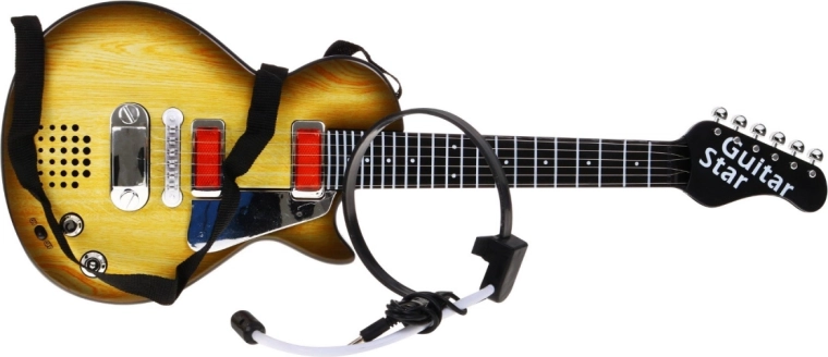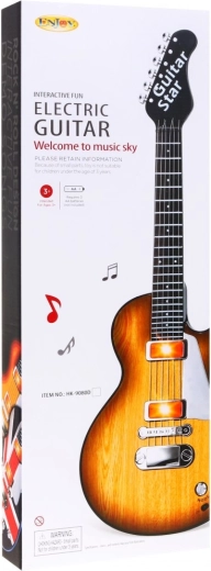 For en større oplevelse er der lyseffekter og lyde samt en justerbar rem for behagelig bæring. I pakken finder du også et headset med høretelefoner og mikrofon, som kan tilsluttes direkte til guitaren – perfekt til at synge og spille samtidig. Legetøjet opfylder CE-certificering og drives af tre AA-batterier.