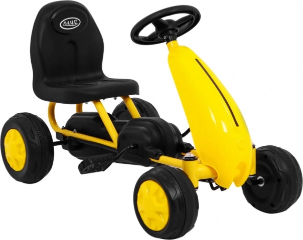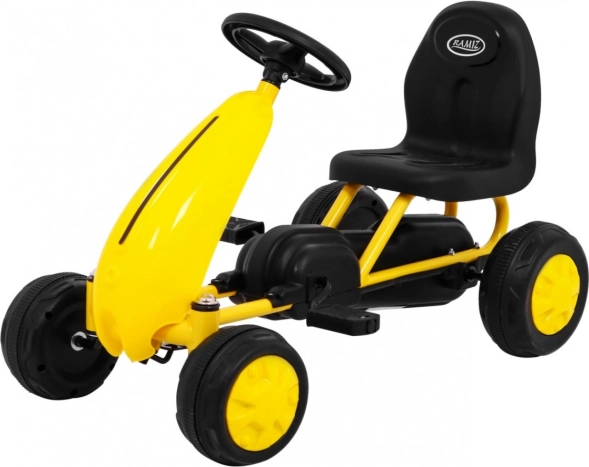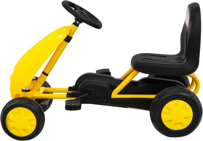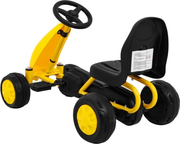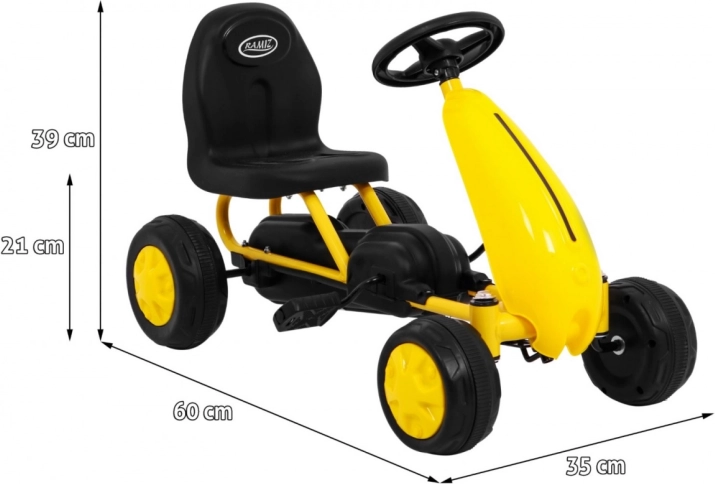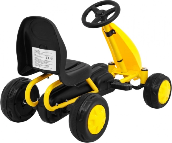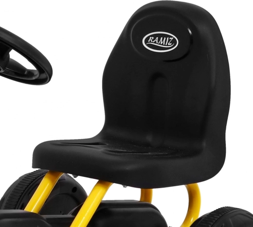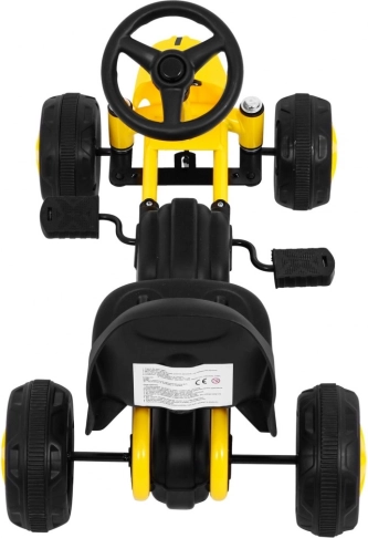 Denne kompakte pedalgokart er et fremragende valg til de første køreture. Takket være det fuldt indkapslede kædetræk er kørslen sikker og jævn. Gummiringene på hjulene dæmper vibrationer og forbedrer vejgrebet på både fortov og gårdsplads.