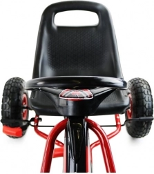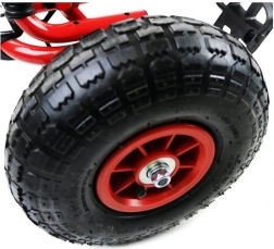 Takket være de oppustelige, brede hjul med markant dækmønster klarer gokarten belægning, græs og parkstier. Håndbremsen, der påvirker begge baghjul, giver tryghed på nedkørsler, mens indkapslet kæde og skridsikre pedaler øger sikkerheden. Overfladebehandling med kvalitetslak beskytter mod ridser og vejr.