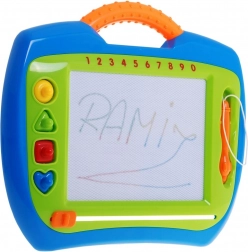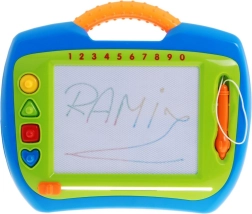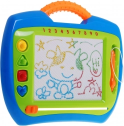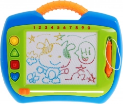 Denne magnetiske tegnetavle understøtter kreativitet, finmotorik og koncentration. Tegnefladen har fire farvesektorer (gul, blå, rød, grøn), så tegningerne virker levende, og børn øver genkendelse af farver og former på en naturlig måde. Stylussen er fastgjort med en snor, så den ikke bliver væk, og skyderen under tegnefladen sletter alt med ét træk.
