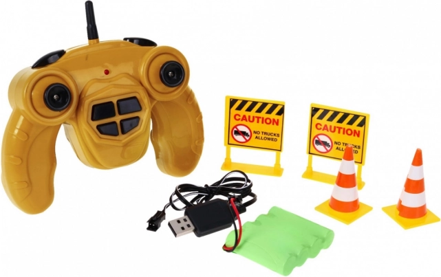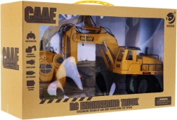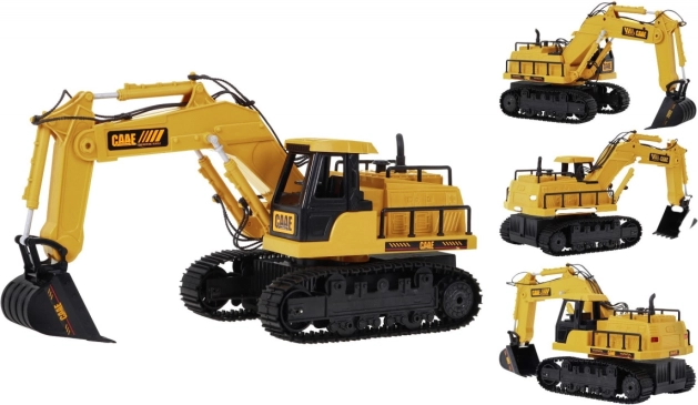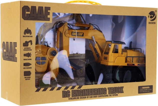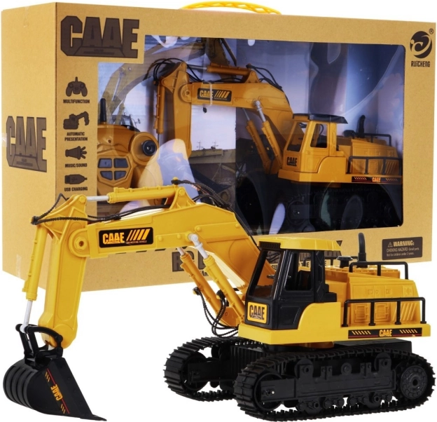 | | Gravemaskinen er enhver lille byggers drøm. Solid udførelse, levende farver, plast af høj kvalitet. Køretøjet kører baglæns, forlæns, drejer til højre og venstre. Under kørsel høres maskinlyd. Ved kørsel baglæns høres bakalarm. Det roterende bomarm (360 grader) graver, op og ned, styres med fjernbetjeningen. Tutan og livlig musik. Gravemaskinen arbejder på 2,4 GHz-båndet. Legetøjet er egnet til børn fra 3 år og har CE-certifikat. Miljøvenlig kuffert-type emballage med bærehåndtag. | Sætteindhold | - Gravemaskine (drevet af 4,8 V batteri – medfølger), - fjernbetjening (drevet af 2 x AA batterier – medfølger ikke), - USB-kabel, - 2x advarselstavle, - 2x kegle. | Mål | |