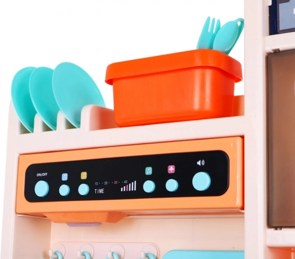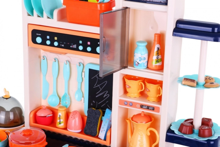 - Rindende vand fra hanen, lys- og lydeffekter, interaktiv brænder med damp, lydpanel, emhætte med lys, drejeknapper, åbningsbar ovn og køleskab, ur med bevægelige visere, kridttavle, æggekoger med lys og lyde