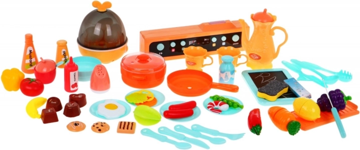 Pakken rummer 65 dele tilbehør: service, madvarer med velcro, køkkenredskaber, kridttavle samt en special æggekoger med lys og lyd. Køkkenet er stabilt, farverigt og perfekt i størrelsen til børn fra 3 år.