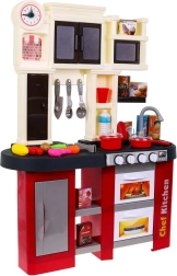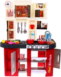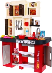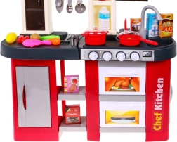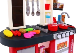 Dette rummelige plastkøkken i rød-sort design giver børn fra 3 år en autentisk madlavningsoplevelse. Realistiske lyseffekter og lyde af madlavning og stegning ved drejning af knapperne understøtter kreativ leg og finmotorik. Med en arbejdende vandhane, der løfter legen til næste niveau.