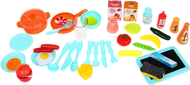 Der medfølger en funktionel vask med vandhane, som kan fyldes med vand, et åbnbart køleskab, praktiske hylder og en kridttavle (skrivetavle) over komfuret, hvor børnene kan skrive deres opskrifter eller lister. Sættet indeholder i alt 42 elementer, herunder service, madvarer og køkkentilbehør. Legetøjet drives af 3× AA-batterier (medfølger ikke) og har CE-certificering.