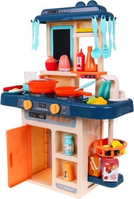 Dette farverige køkken er flot udført, har livlige farver og rigt tilbehør, som understøtter kreativ leg og udvikling af finmotorik. Når man drejer på knapperne, afspilles madlavningslyde, og et rødt lys tændes. En af brænderne skaber desuden let damp, hvilket gør legen meget realistisk.