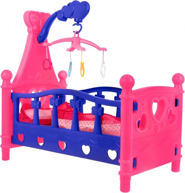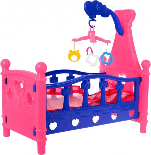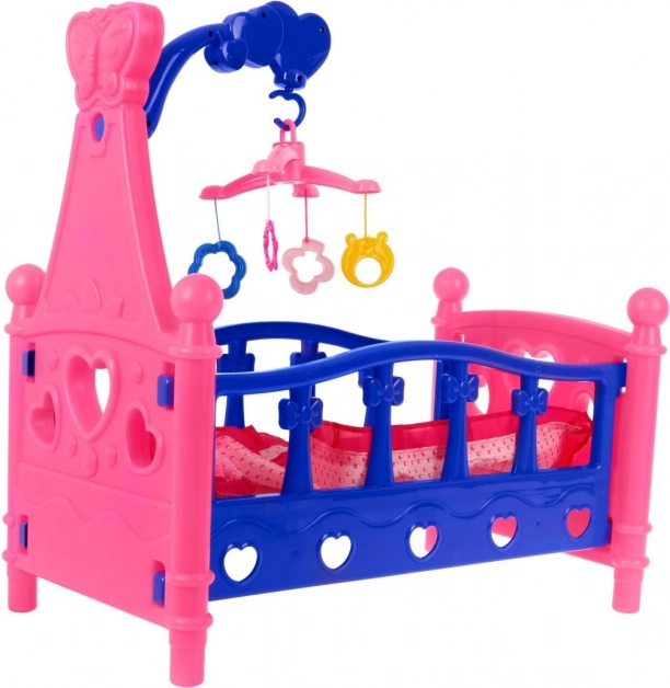 En sød dukkeseng med farverig karrusel og blød tilbehørsgarderobe vil glæde enhver lille omsorgsperson. Takket være den stabile plastkonstruktion, hjerteformede detaljer og den medfølgende pude og tæppe er den ideel til rolleleg i hjemmet og til at lægge dukker i seng. Karrusel med hængende legetøj stimulerer fantasien, komplet udstyr i pakken sparer forældrenes tid, og nem montering sikrer en hurtig start på legen.