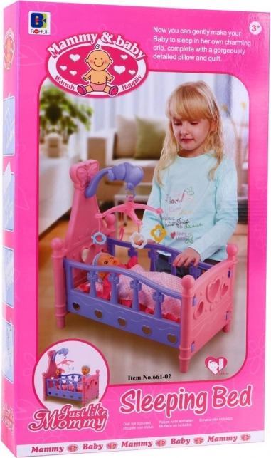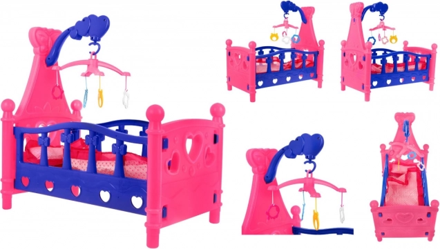 - Komplet sæt: dukkeseng, karrusel med legetøj, pude og tæppe
