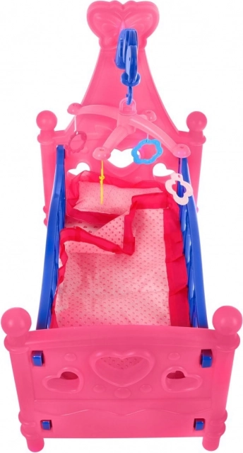 Denne dukkeseng er et skønt supplement til ethvert børneværelse. Den skiller sig ud med en glad rosa-blå farvekombination, hjerteformede udskæringer og en funktionel karrusel med farverige vedhæng. Der medfølger også stofmadras, pude og tæppe, så yndlingsdukken kan sove behageligt.