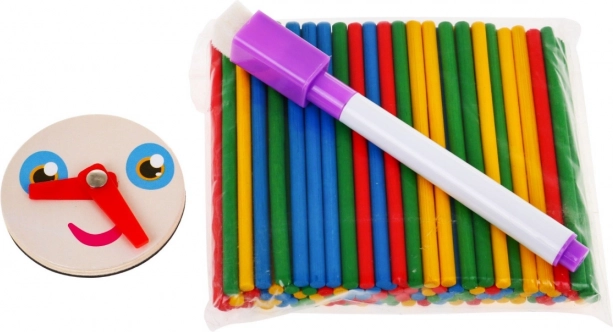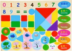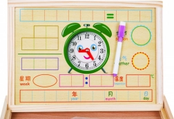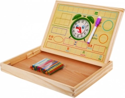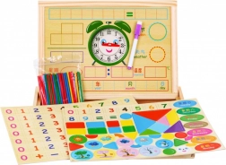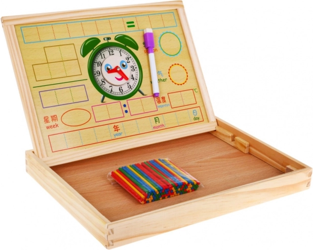 Dette kvalitets træ-sæt er designet til at give børn mange muligheder for læring og underholdning. Det hjælper dem med at lære tal, addition, subtraktion, multiplikation og division, lærer dem at orientere sig i tiden takket være det magnetiske ur og at genkende former, ugedage, vejr og årstider. Den dobbeltsidede magnettavle og den tørløselige tusch understøtter gentagen øvelse uden rod.