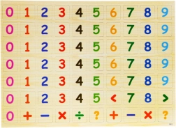 - Trækasse med gangetabel på undersiden; magnetiske kort med tal; magnetiske kort med tegn (+, −, ×, ÷, >, <, =, ?); farvede magnetiske former; magnetiske brikker med vejr, årstider og ugedage; magnetisk ur; dobbeltsidet magnettavle; farvede træ-tællestave; billedvejledning; tørløselig tusch med magnet
