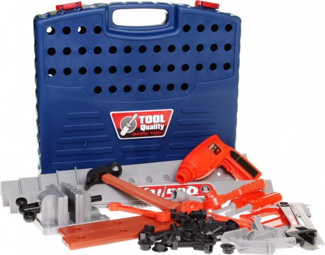 - I alt 45 dele: boremaskine, hammer, nøgler, sav, skruetrækkere, plader, skruer, møtrikker