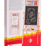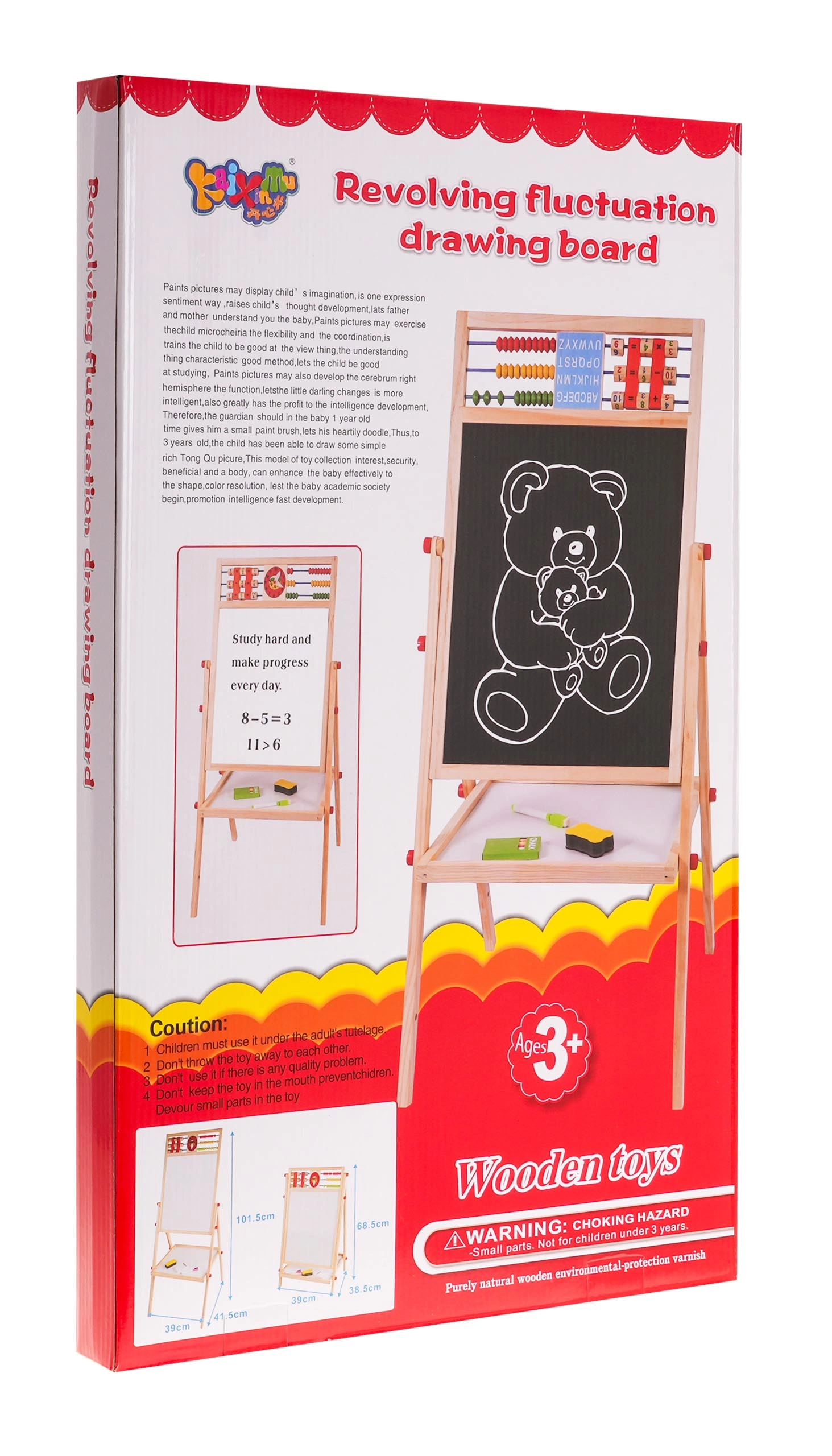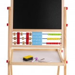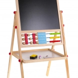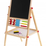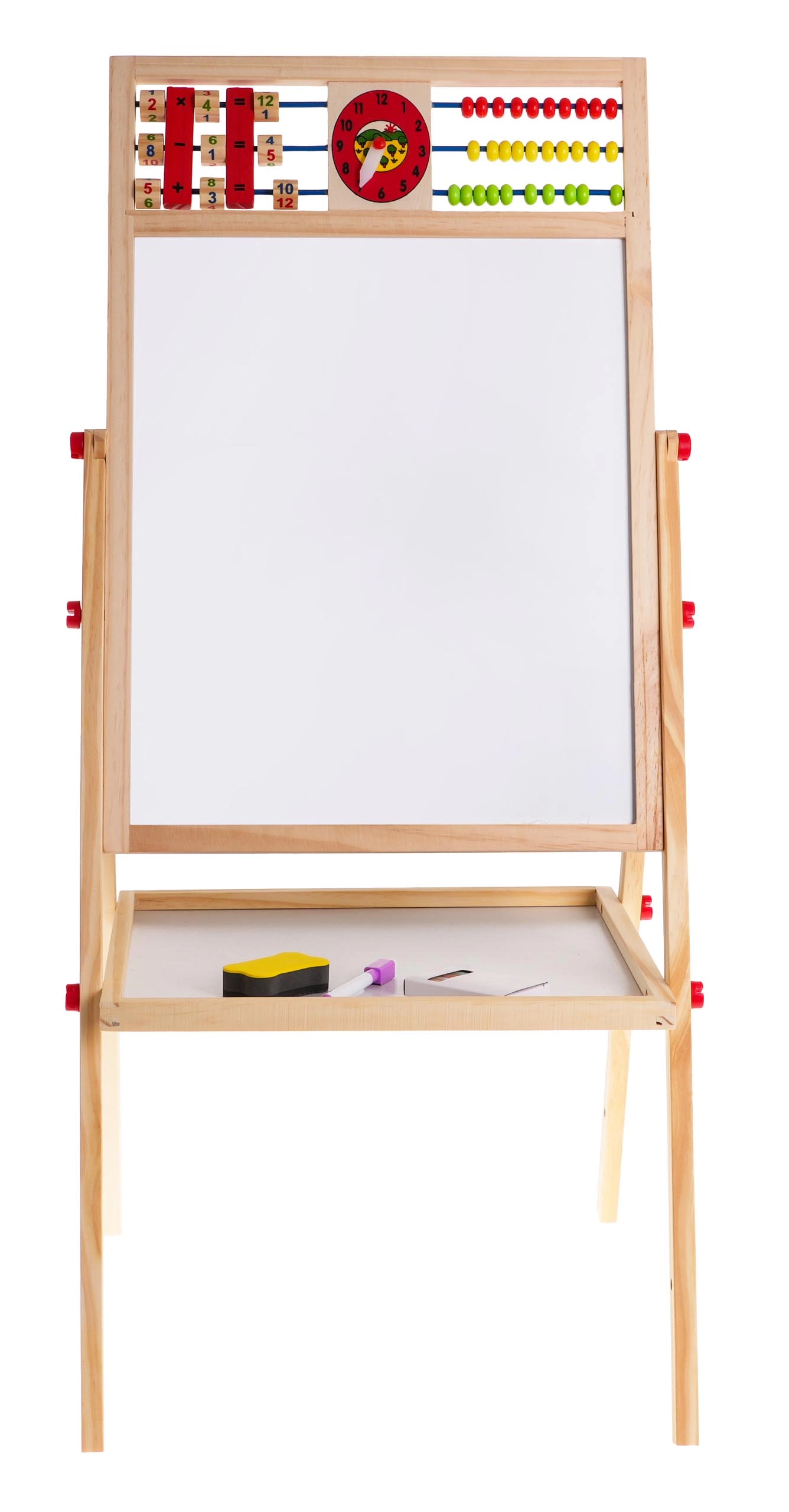 Stor træ, dobbelt-sidet tavle til børn fra 3 år med hvid magnetisk whiteboard-side og sort kridttavle. Inklusive kugleramme, læreur og matematisk puslespil, praktisk hylde og justerbar højde. I pakken er der tusch med visker, farvede kridt og svamp – alt til kreativ skrivning, tegning og læring gennem leg.