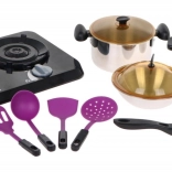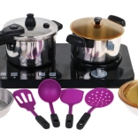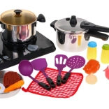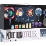 Et fantastisk, veludstyret køkkensæt bestående af induktionskogeplade, gryder og tilbehør til madlavning, beregnet til børn fra tre år. Pande, gryde og trykkoger ligner de rigtige, men i miniatureudgave. Induktionskogepladen drives af 3 x AA 1,5 V batterier (medfølger ikke) og er udstyret med lyd- og lyseffekter. Til venstre er der en oplyst brænder med kogelyde og et panel til at ændre kogetiden fra 2 til 20 minutter. Til højre er der en oplyst brænder med stegelyde og en tænd/sluk-knap. Sættet indeholder også legetidsmad.