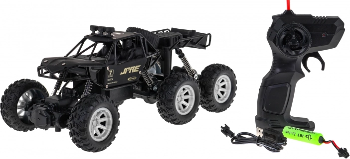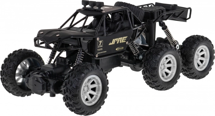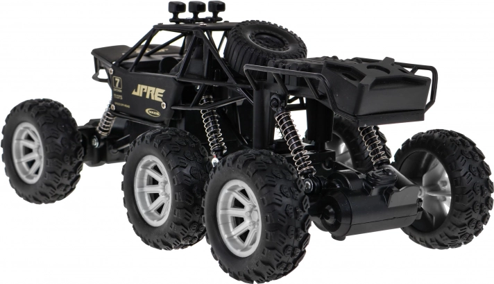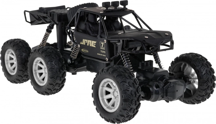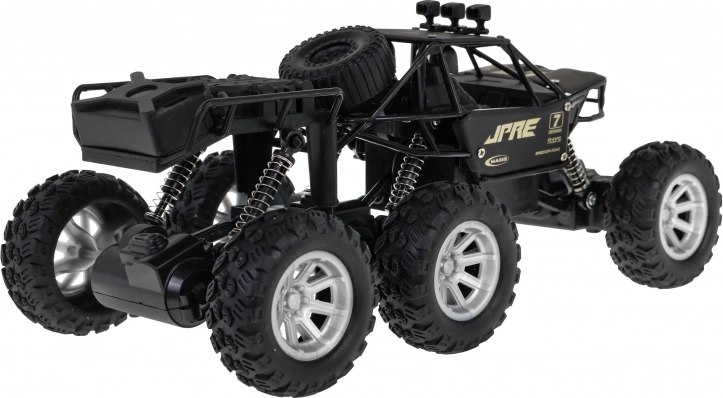 Bilen er desuden udstyret med firehjulstræk, der sikrer robust kraft og præcis bevægelse. Fjernbetjeningen muliggør nem manøvrering med en rækkevidde på op til 27 MHz.
