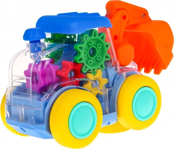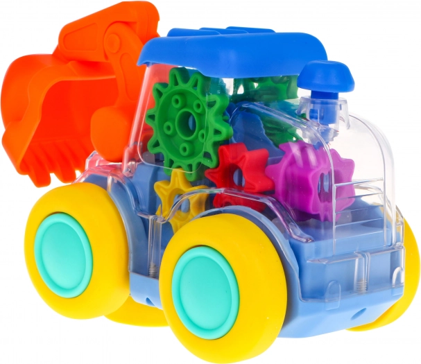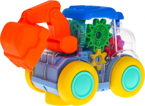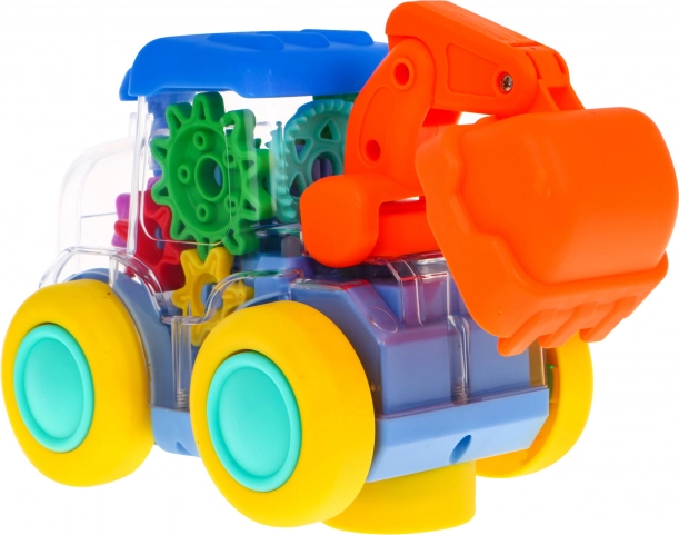 Denne farverige entreprenørmaskine kombinerer leg og læring. Det gennemsigtige karrosseri afslører roterende tandhjul, som vækkes til live under kørsel og fascinerer enhver lille bygmester. Gravamaskinen er batteridrevet og drejer takket være en smart mekanisme, når den rammer en forhindring, og kører videre. Lys og melodier skaber stemning, mens den bevægelige skovl indbyder til endnu flere legeidéer.