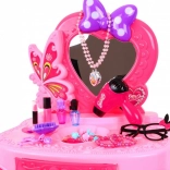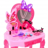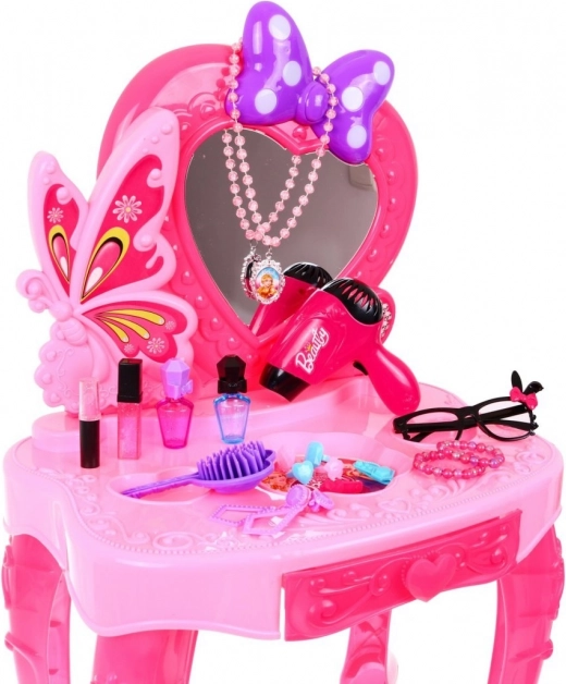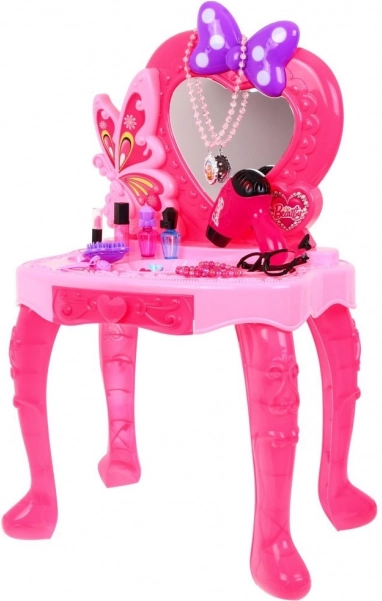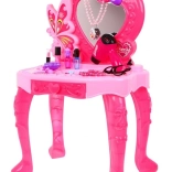 Dette lyserøde børnetoiletbord forvandler ethvert værelse til et magisk skønhedshjørne. Hjertespejlet prydes af en sløjfe med lyseffekter og en behagelig melodi, der stimulerer fantasien i legen som skønhedssalon. Der følger også en funktionel legetøjs-hårtørrer med realistisk lyd og blæs, hvilket gør legen endnu mere autentisk.
