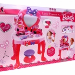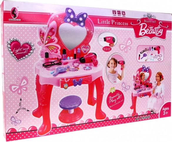Den praktiske skuffe gemmer alle småting, mens den medfølgende skammel sikrer behagelig siddekomfort. Det rige sæt smykker og kosmetiske rekvisitter lader børn udforske stil og udvikle finmotorik samt sociale færdigheder i fælles leg.