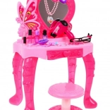 Det søde, lyserøde toiletbord til små stylister byder på lys- og lydeffekter, en interaktiv hårtørrer med luftblæsning og et rigt sæt tilbehør til kreativ leg. Der medfølger også en åbnbar skuffe til skatte, et stabilt bord med spejl og en komfortabel skammel. Ideelt til børn fra 3 år med fokus på fantasi, rolleleg og finmotorik.