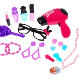 - Toiletbord, skammel, hårtørrer, briller, kam ca. 12 × 7 cm, halskæde, 2× armbånd, 4× ring ca. 2,5 × 2,5 cm, 2× hårspænde ca. 4 × 2 cm, imitation af læbestift ca. 6,5 × 1,5 cm, 3× flakon ca. 7,5 × 3 cm, vedhæng med prinsesse ca. 4 × 3 cm, 2× øreringe, klistermærker
